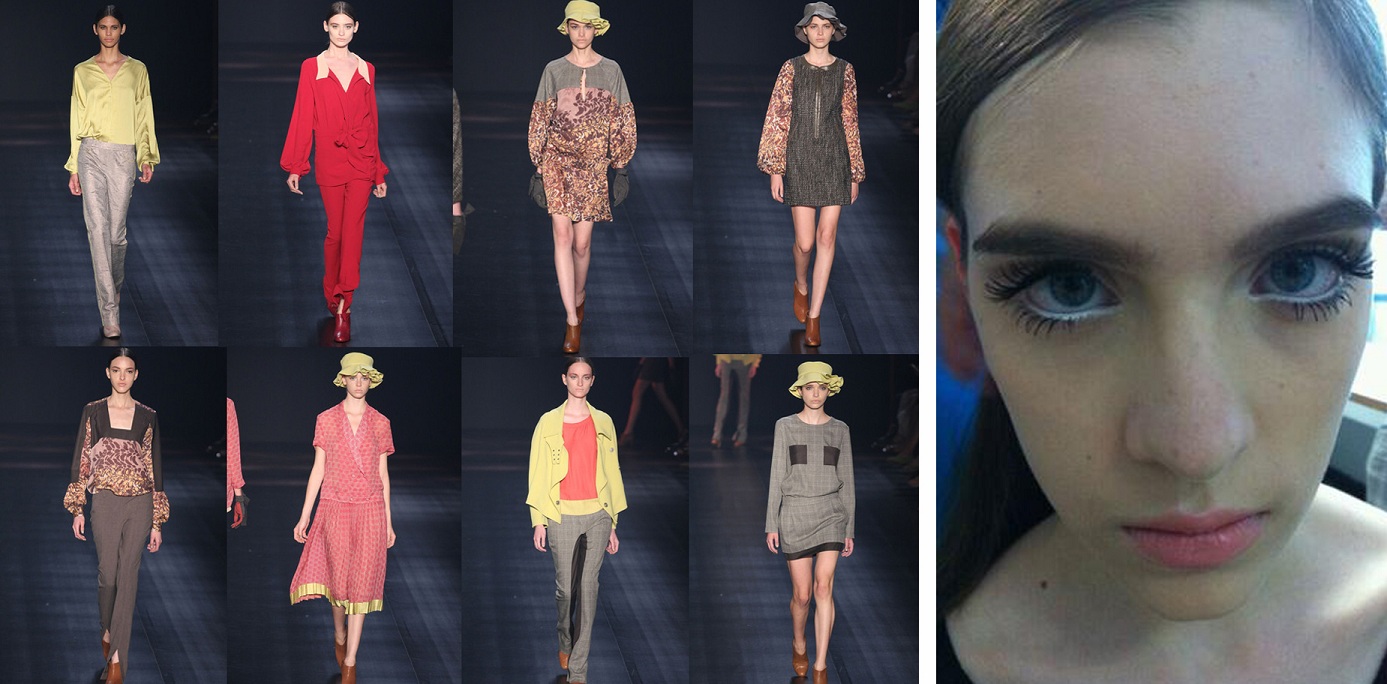 Maria Garcia desfilou peças românticas com chapéus e lenços em cores delicadas. Conjuntos de veludo com estampas em diversos materiais, calças com aberturas nos tornozelos, alfaiataria em xadrez misturada com floral e couro marrom. Na maquiagem, a marca apostou no lápis branco aplicado na linha d’água do olho e muitos cílios postiços.